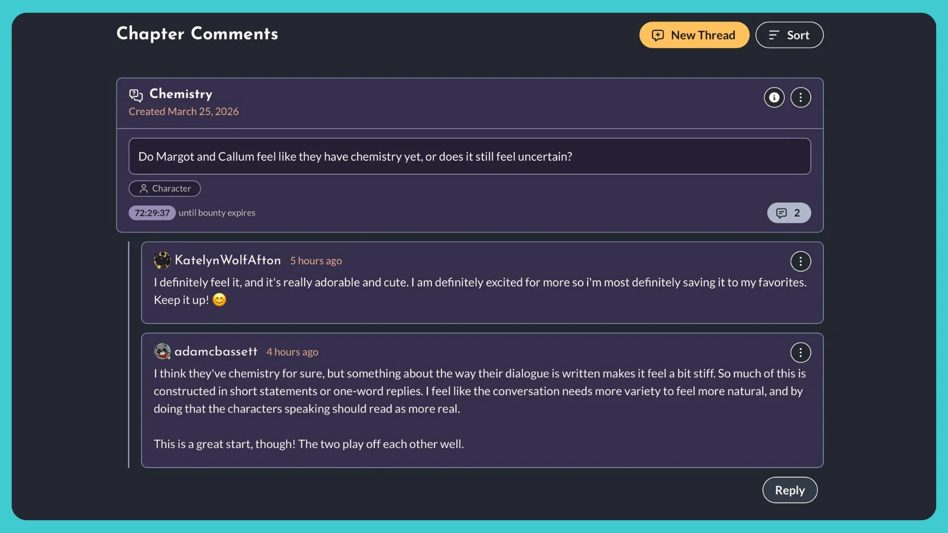 Read stories with Feedback Bounties and reply to them with helpful feedback for a chance to be awarded with $1 Credits! It’s a huge help to authors seeking feedback on their work, and you get a little cash for the next coffee run.