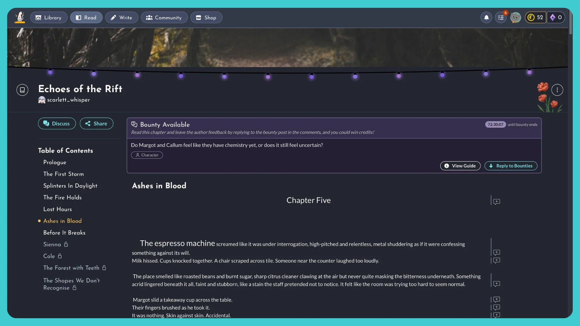 Read stories with a Bounty, thenreply to them with helpful feedback for a chance to be awarded with $1 Credits! Not only is it a huge help to authors, Credits can be exchanged for awesome awards in StoryForge, or cashed out for real money.
