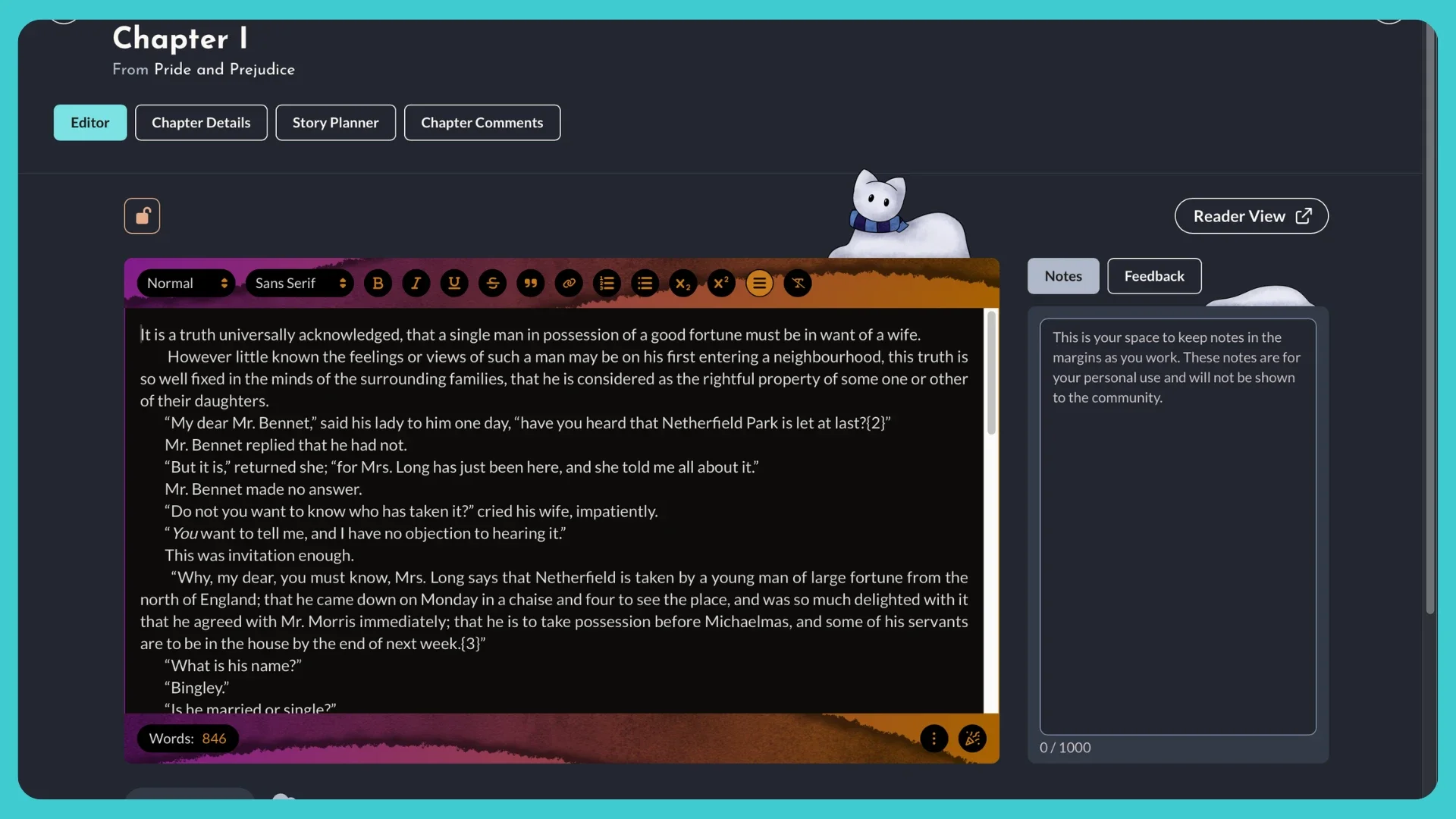 Whether you’re writing a novel, short story, or something else—fiction or non-fiction—StoryForge’s manuscript editor has the tools to help you get it done. The text editor works alongside an easy-to-use notepad, and access to feedback from readers all on the same page.